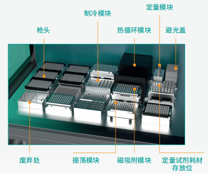 包含20個(gè)標(biāo)準(zhǔn)盤(pán)位,整合PCR儀、定量模塊,實(shí)現(xiàn)建庫(kù)過(guò) 程中各類酶反應(yīng)、PCR擴(kuò)增、文庫(kù)定量等自動(dòng)化操作
