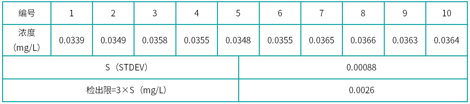 將儀器調(diào)到正常狀態(tài),使用濃度為0.015mg/L的氨氮溶液進(jìn)樣,重復(fù)10次,測量標(biāo)準(zhǔn)偏差,3倍標(biāo)準(zhǔn)偏差即為檢出限。檢出限測試結(jié)果如下表2,檢出限為0.0026mg/L,達(dá)到國標(biāo)要求0.01mg/L。